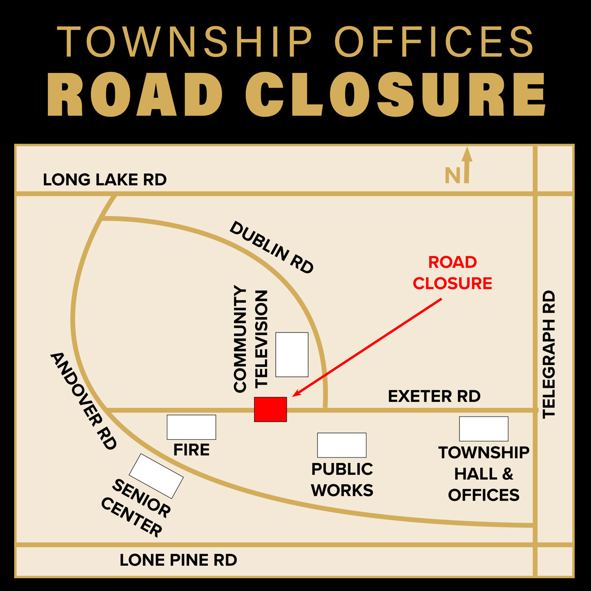 Beginning Monday, July 24 a scheduled road closure on Exeter Rd. will impact traffic to Township Offices. While the closure will prevent vehicles from driving straight through from Telegraph to Andover, complete access to all Township buildings will be possible through use of Dublin Rd or parking lot access.