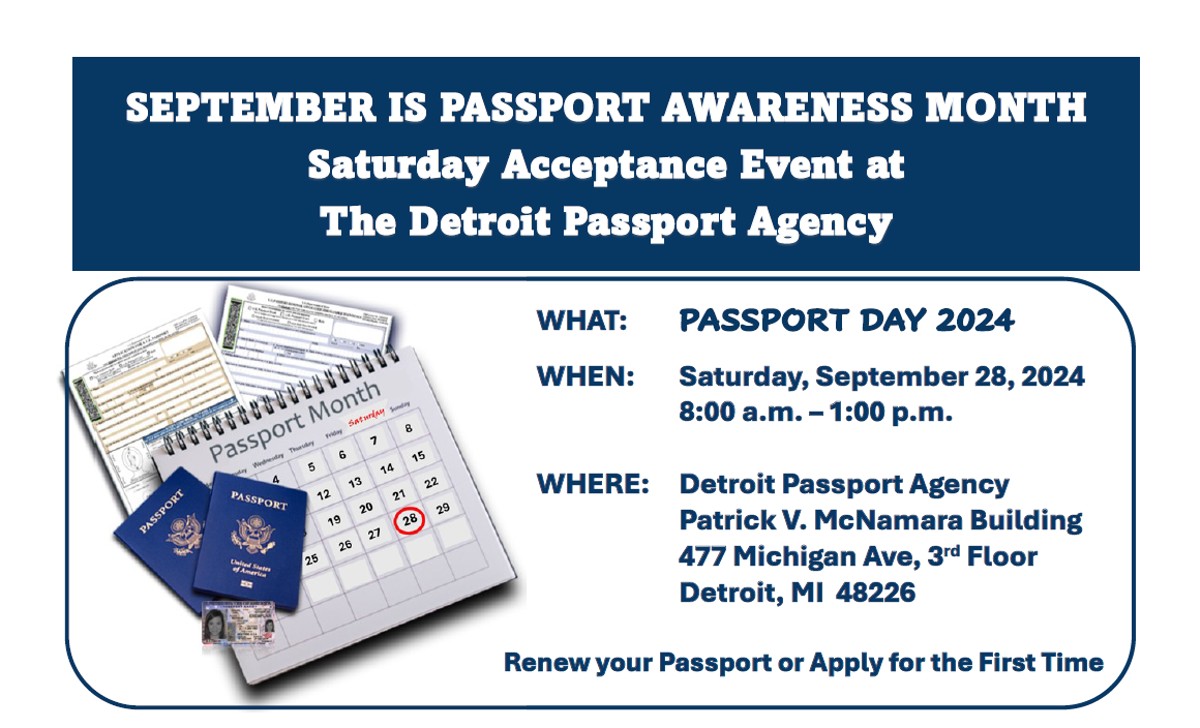 More importantly, the City of Detroit is hosting an event on Saturday, September 28, 2024. This is the perfect opportunity to renew your passport or apply for your first one from 8:00 a.m. to 1:00 p.m. at the Detroit Passport Agency: